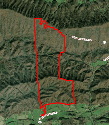 This undeveloped hardwood forest consists of 1,307 acres bordering Jefferson National Forest on two sides. The property was slated to be developed as a residential mountain and part commercial and agricultural development. With 1,000 feet of elevational change, it is a critical conservation property, mapped by Conserve Virginia as an Outstanding Ecological Core, and as having Outstanding Forest Values, and as a key Wildlife Biodiversity Resilience Corridor. The headwaters of Hungry Mother Creek traverse the property to Hungry Mother State park to the west.